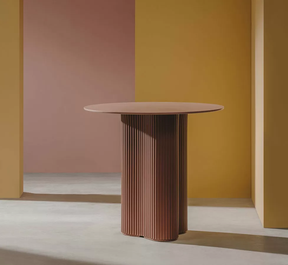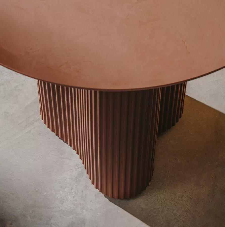 Стол состоит из одного центрального основания, отличающегося скульптурной Т-формой с органичным силуэтом и рифленой поверхностью. Оно выполнено из 100% переработанного термополимера Pure ECO® и доступно в 5 цветах: черный, белый, серый базальт, терракотовый и песочный. Столешница доступна в широком диапазоне форм и отделок, специально подобранных для улицы и обеспечивающих устойчивость, долговечность и высокую эстетическую ценность в сложных климатических условиях.
