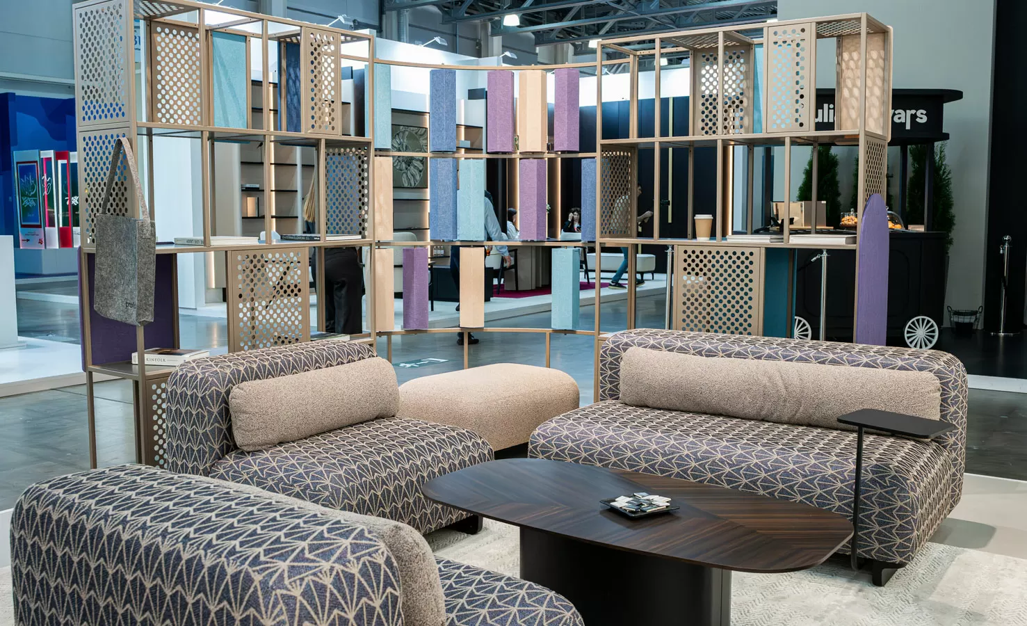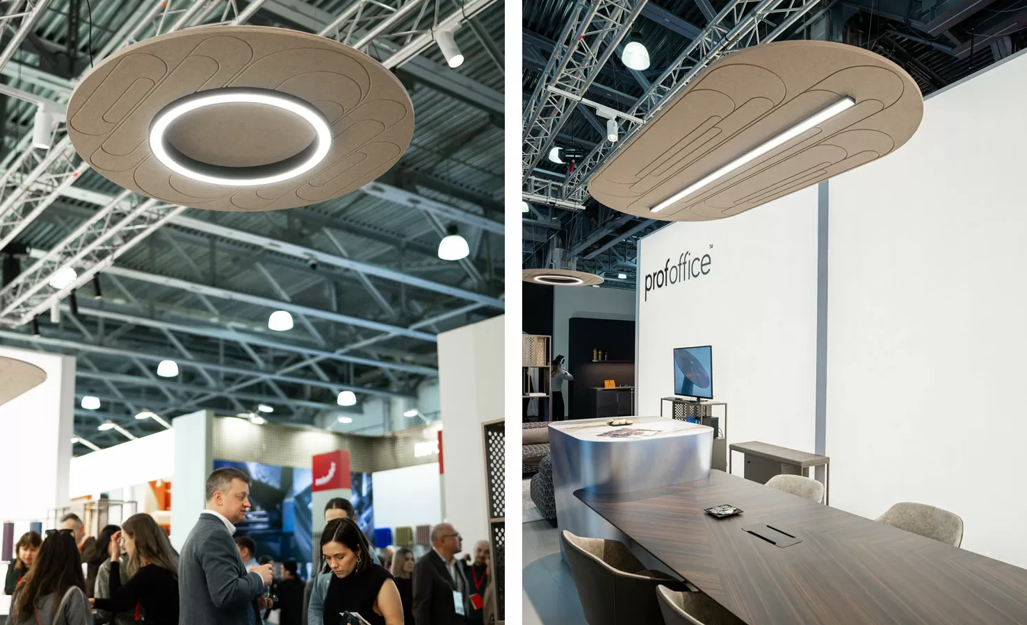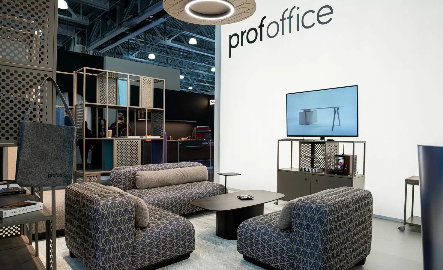 На стенде показали модульную коллекцию стеллажных решений Mindframe, созданную в сотрудничестве с архитектором Фёдором Ращевским, акустические светильники Lint Acoustic и Halo Acoustic со звукопоглощающими панелями и управлением через Bluetooth или протокол DALI. Центром экспозиции стал двухуровневый стол индивидуального изготовления для переговоров и неформального общения, дополненный модульными диванами Just.